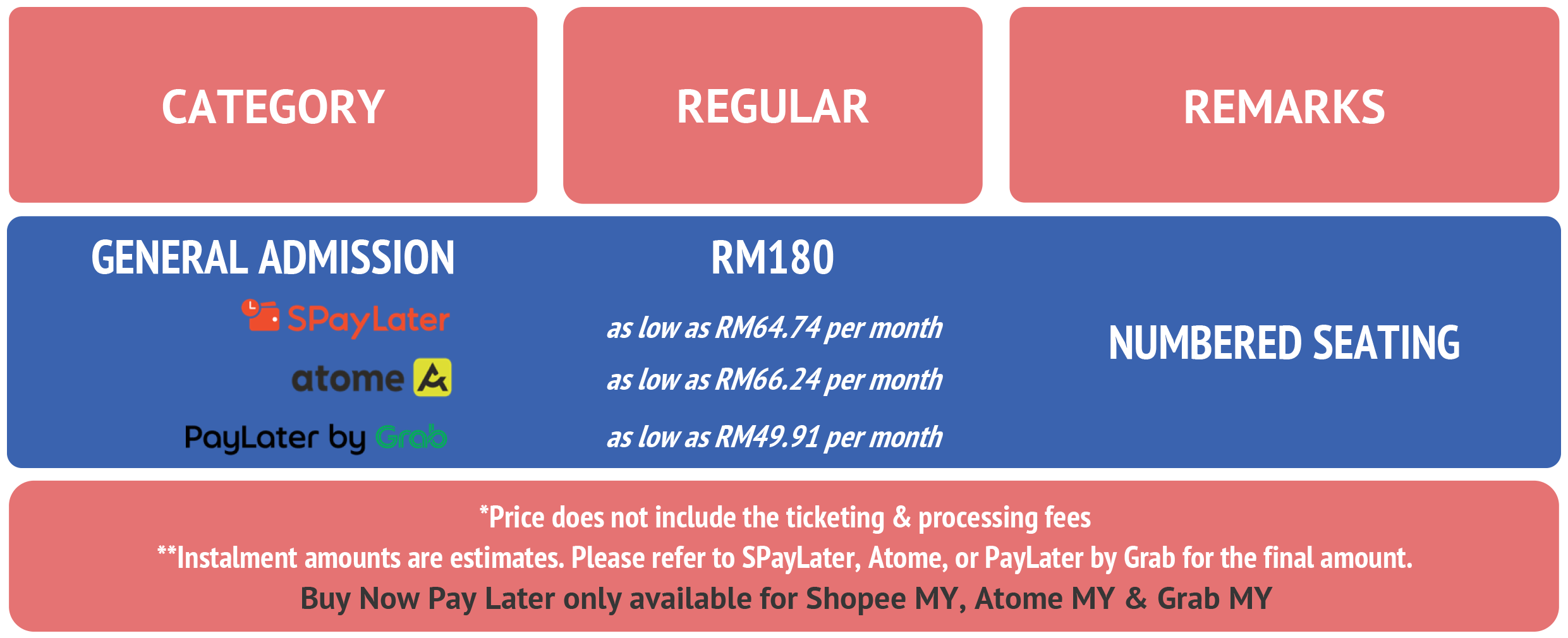 A ticketing fee of RM4.00 per ticket and a processing fee, based on the selected payment method, will be applied at checkout. These fees are non-refundable.