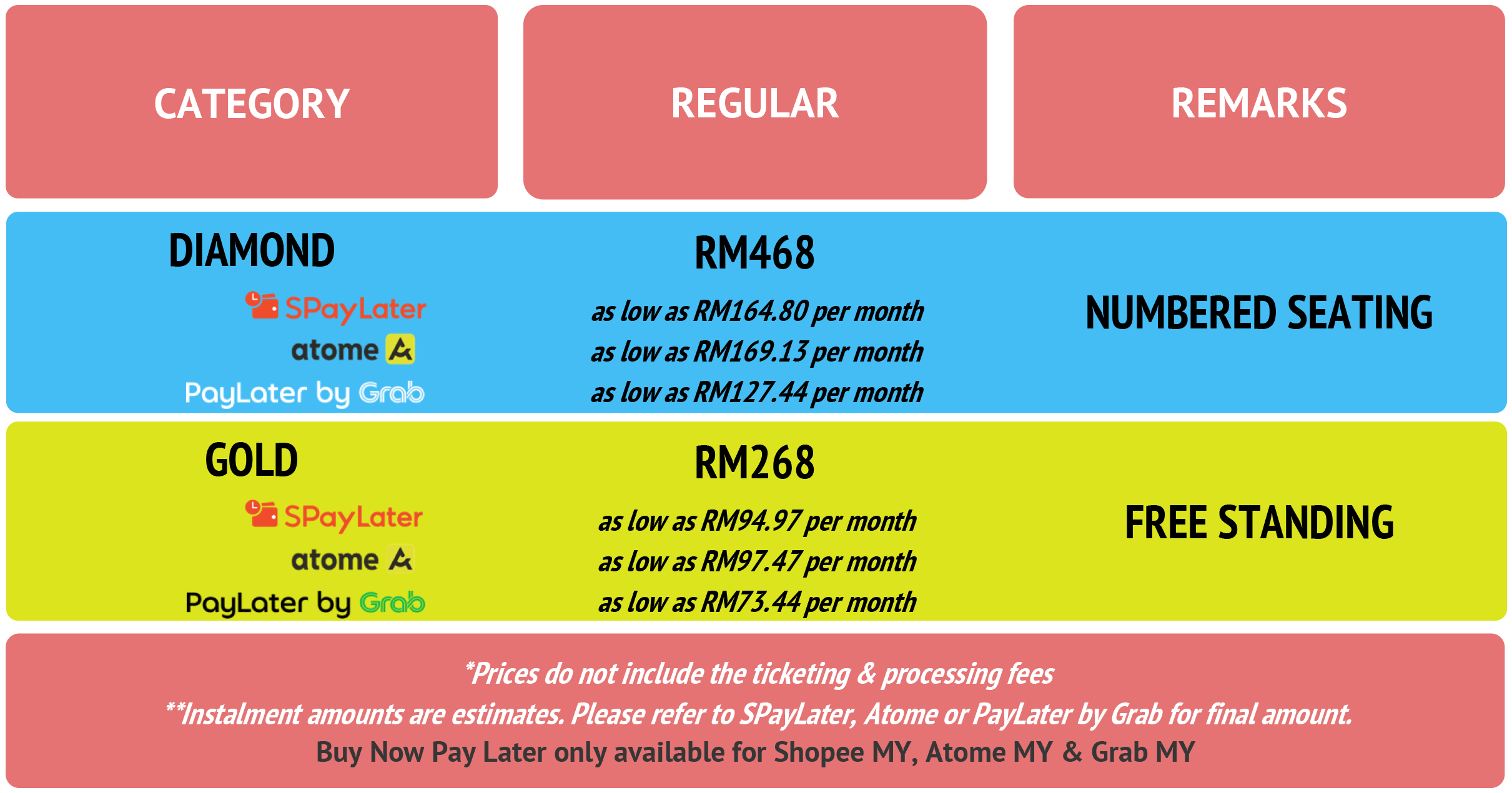 Each ticket admits one (1) person only. Ticket prices are listed in MYR/RM (Malaysian Ringgit) and exclude ticketing and processing fees.