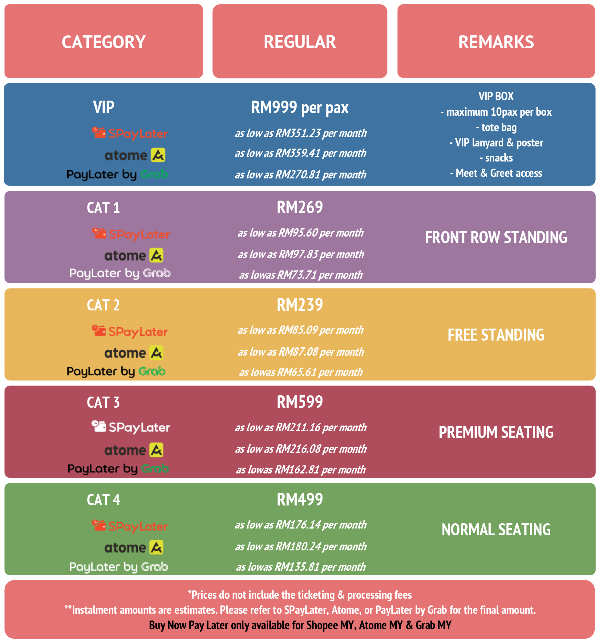 Each ticket admits one (1) person only. Ticket prices are listed in MYR/RM (Malaysian Ringgit) and exclude ticketing and processing fees.